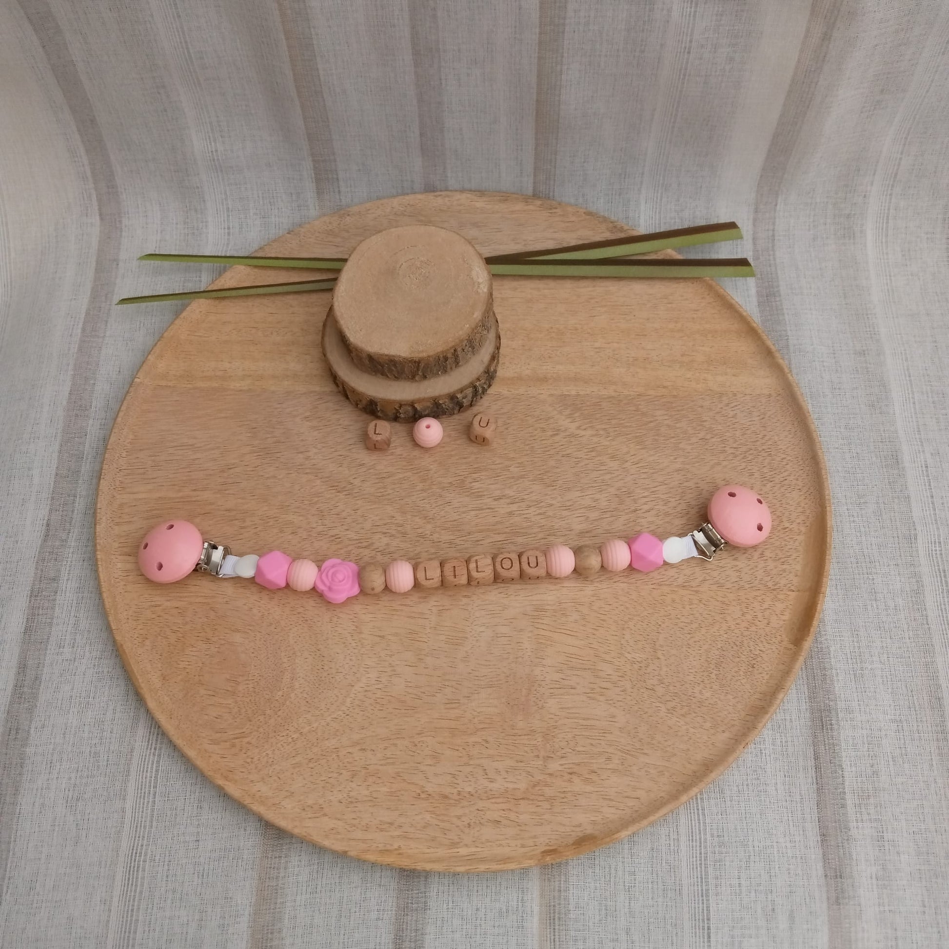 Attache doudou personnalisable : lettres en bois, mélange de perles en silicone et bois, plus de perte de doudou de vos bébés.