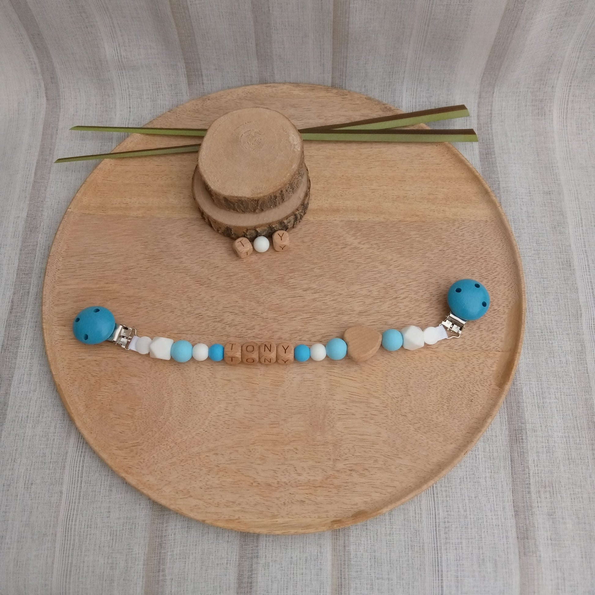 Attache doudou personnalisable : lettres en bois, mélange de perles en silicone et bois, plus de perte de doudou de vos bébés.