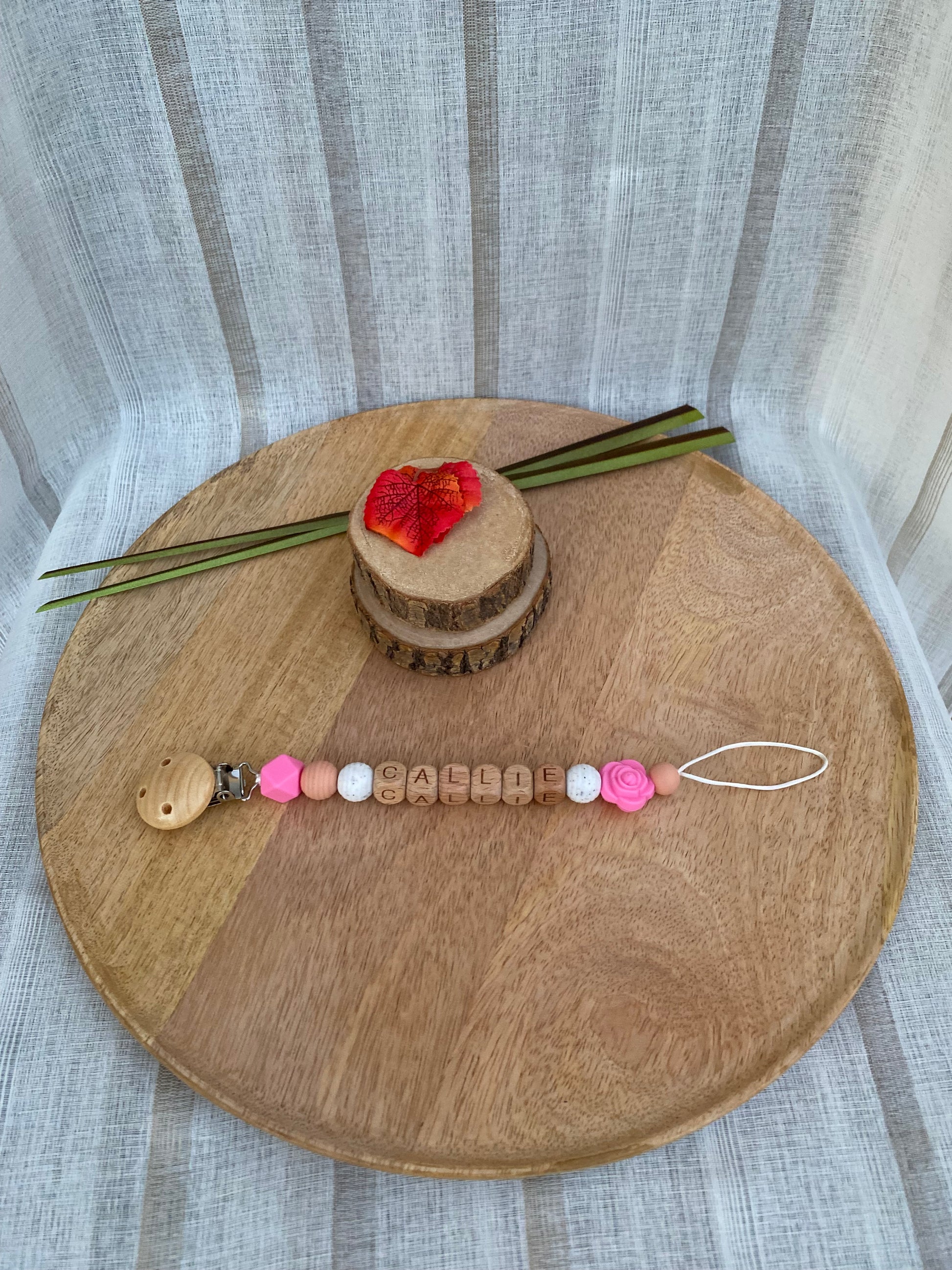 Attache-sucette personnalisable : clip simple, lettre en bois et mélange de perles en silicone.