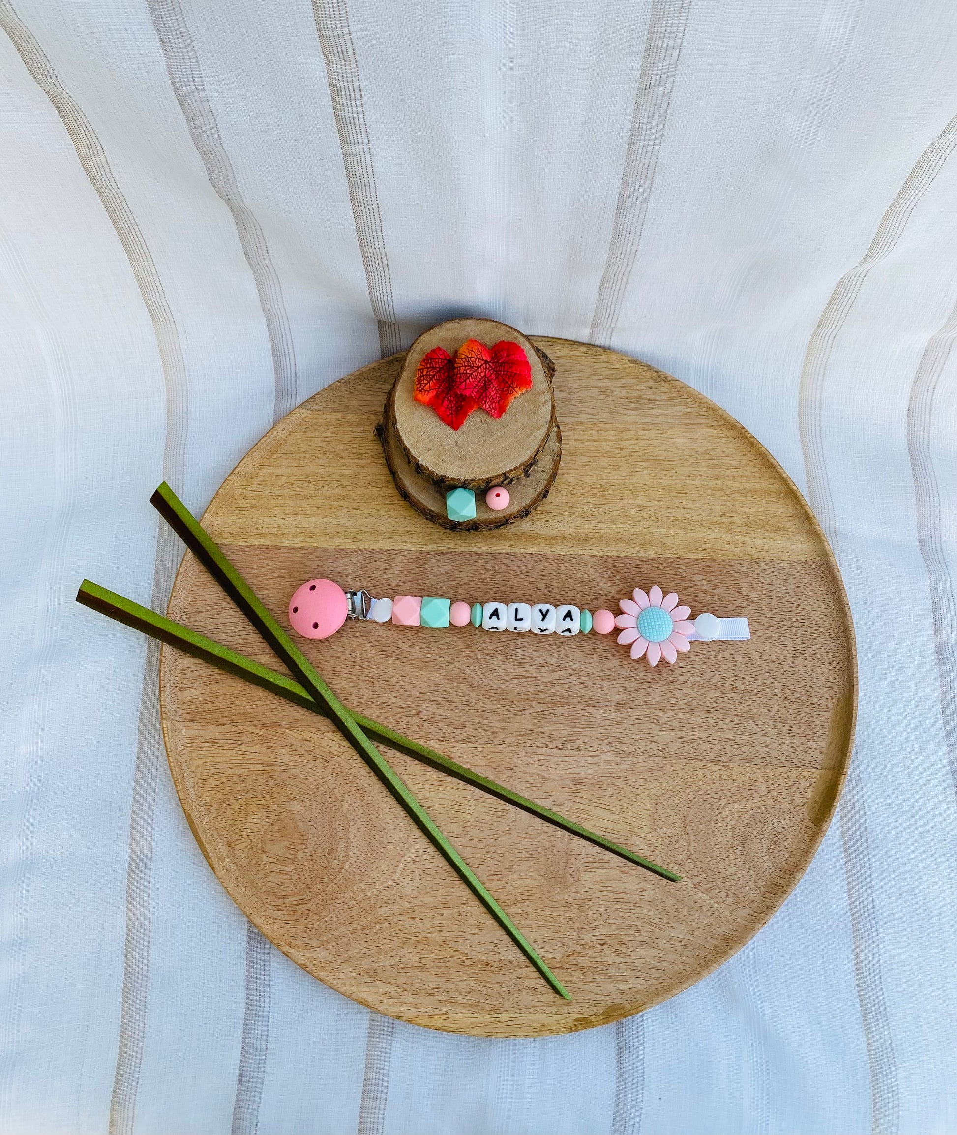 Attache-sucette personnalisable : clip simple, lettres en silicone et mélange de perles en silicone.