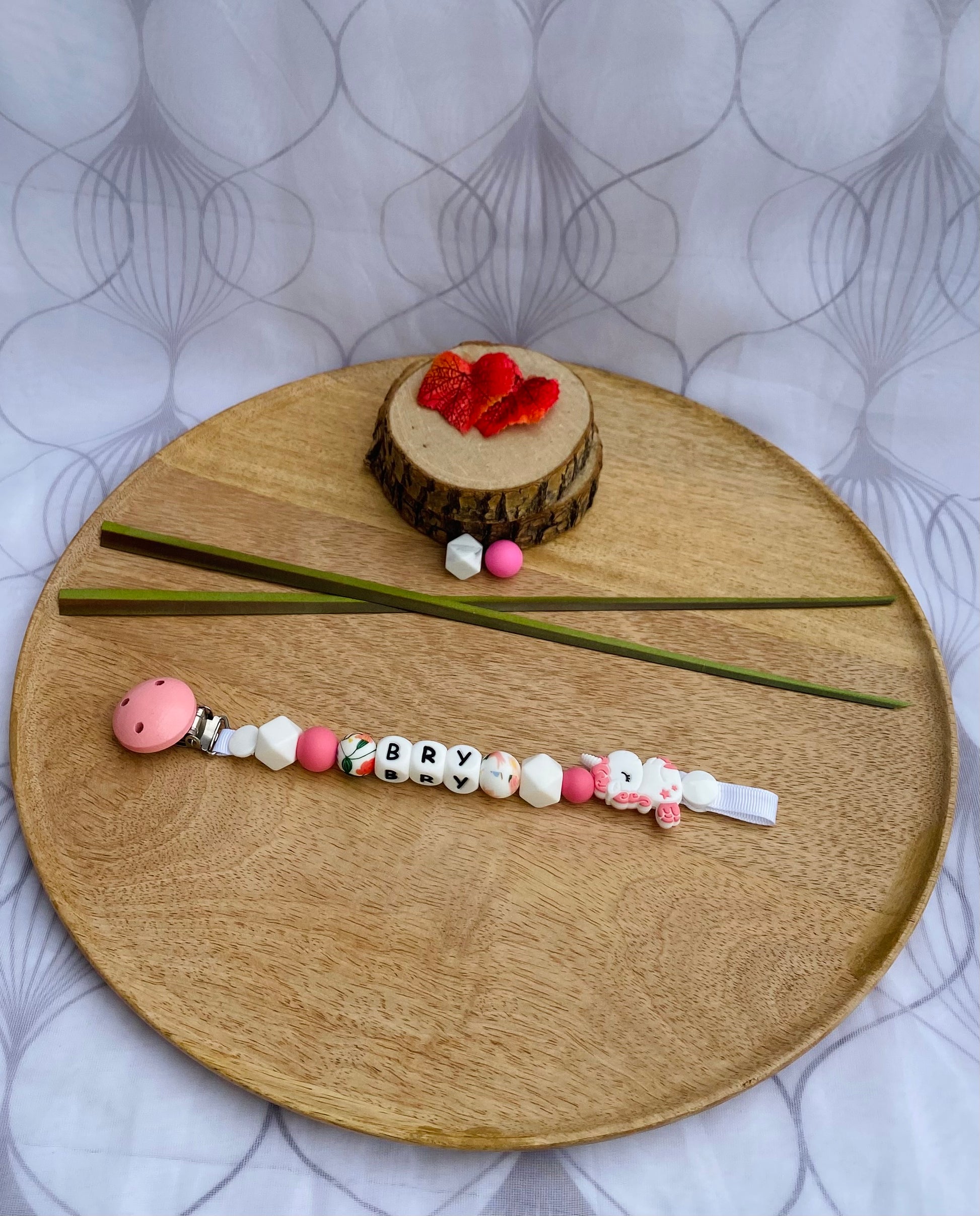 Attache-sucette personnalisable : clip Simple, lettres en silicone et mélange de perles en silicone.