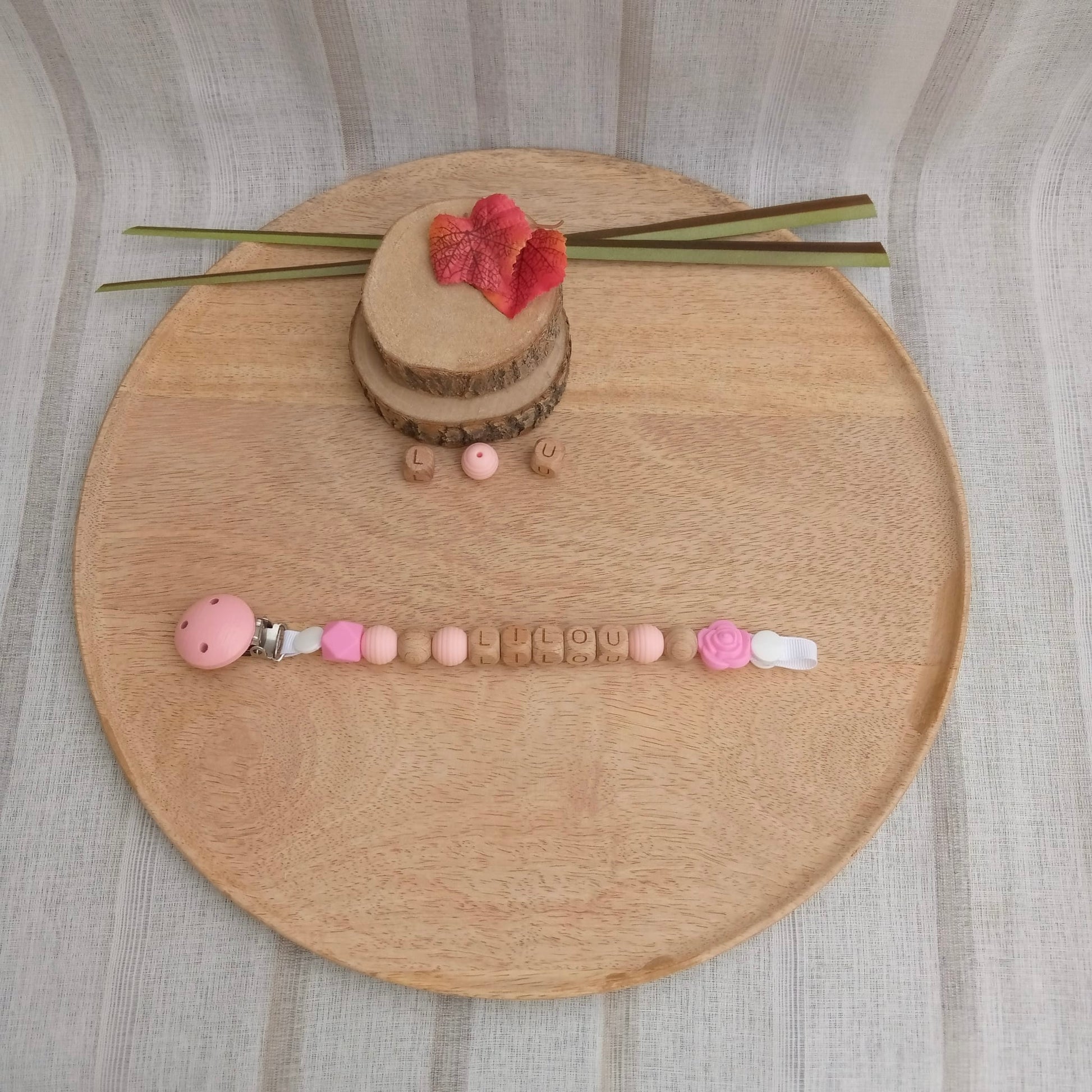 Attache-sucette personnalisable : clip simple, lettres en bois, mélange de perles en silicone et bois.