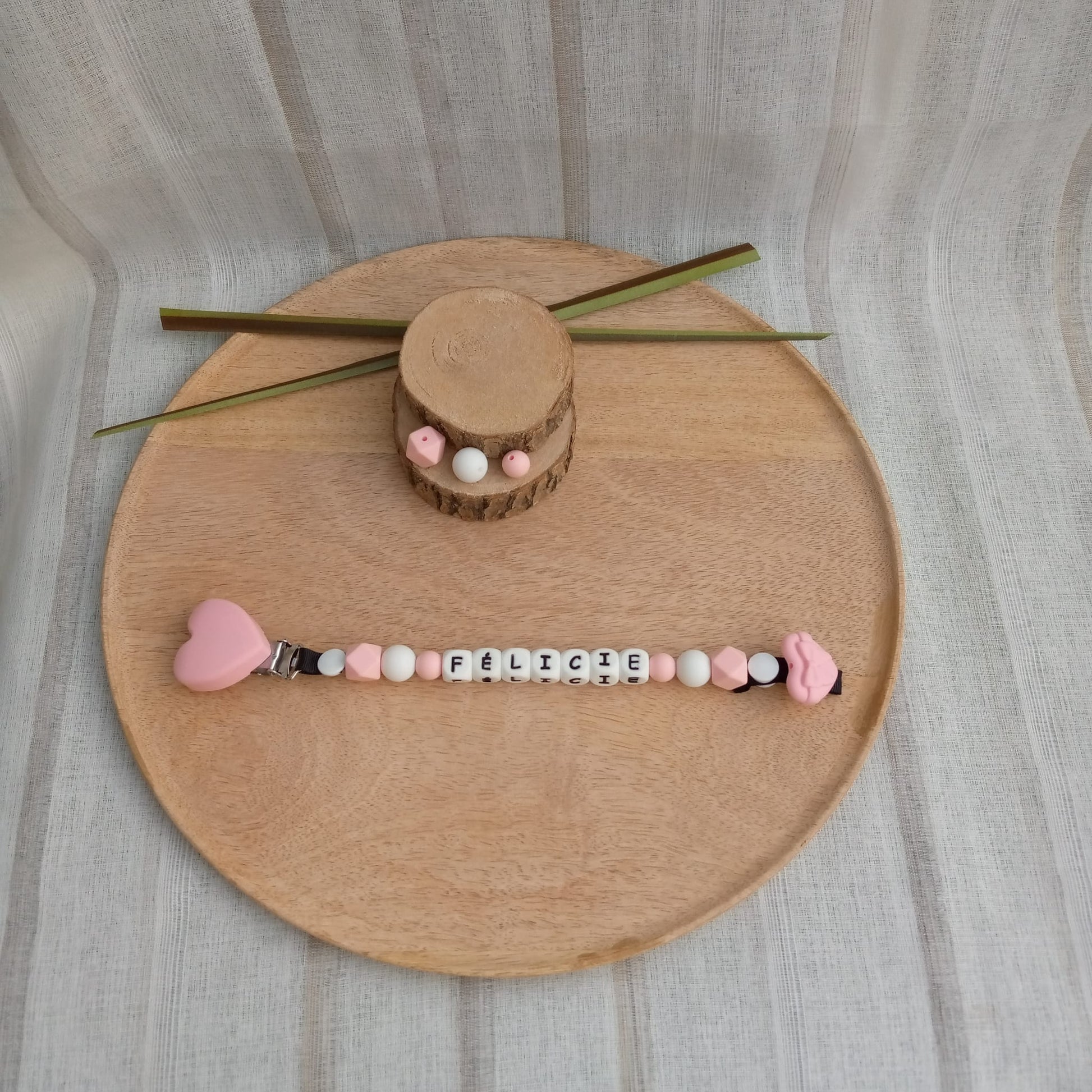Attache-sucette personnalisable : clip Fantaisie, lettres en silicone et mélange de perles en silicone.