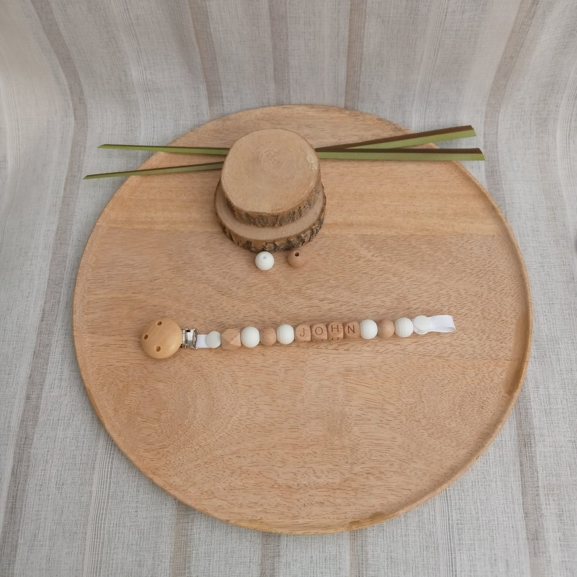 Attache-sucette personnalisable : clip simple, lettres en bois, mélange de perles en silicone et bois.