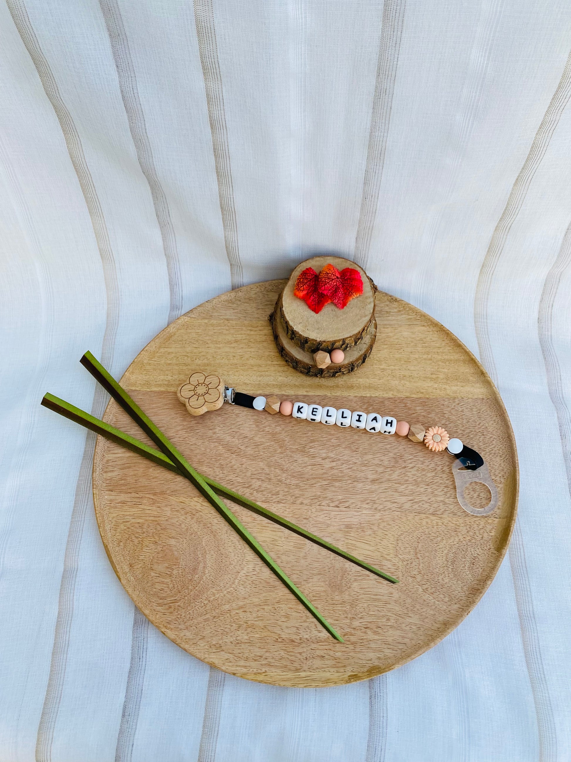 Attache-sucette personnalisable : clip Fantaisie, lettres en silicone, mélange de perles en silicone et bois.