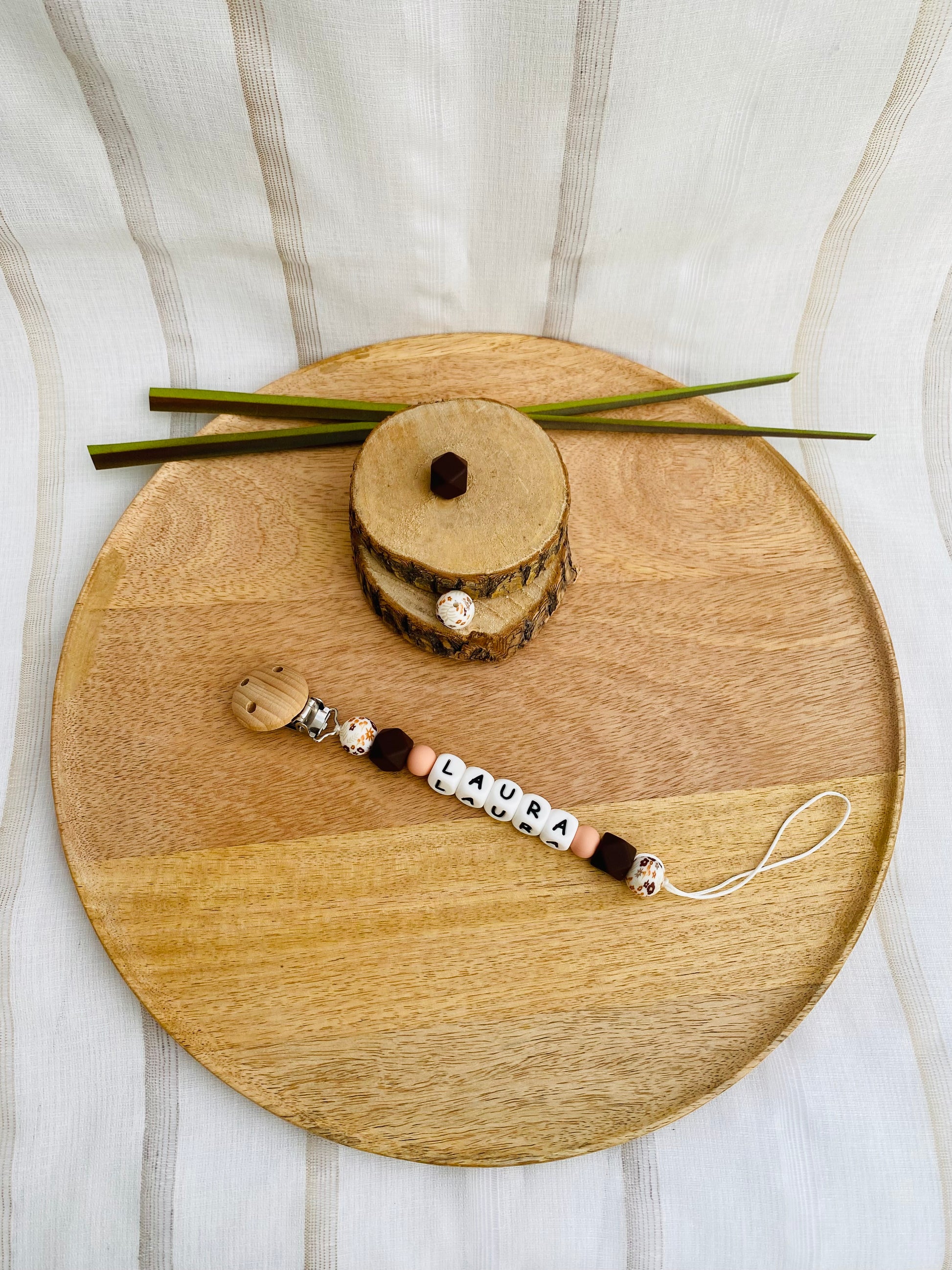 Attache-sucette personnalisable : clip Simple, lettres en silicone et mélange de perles en silicone.