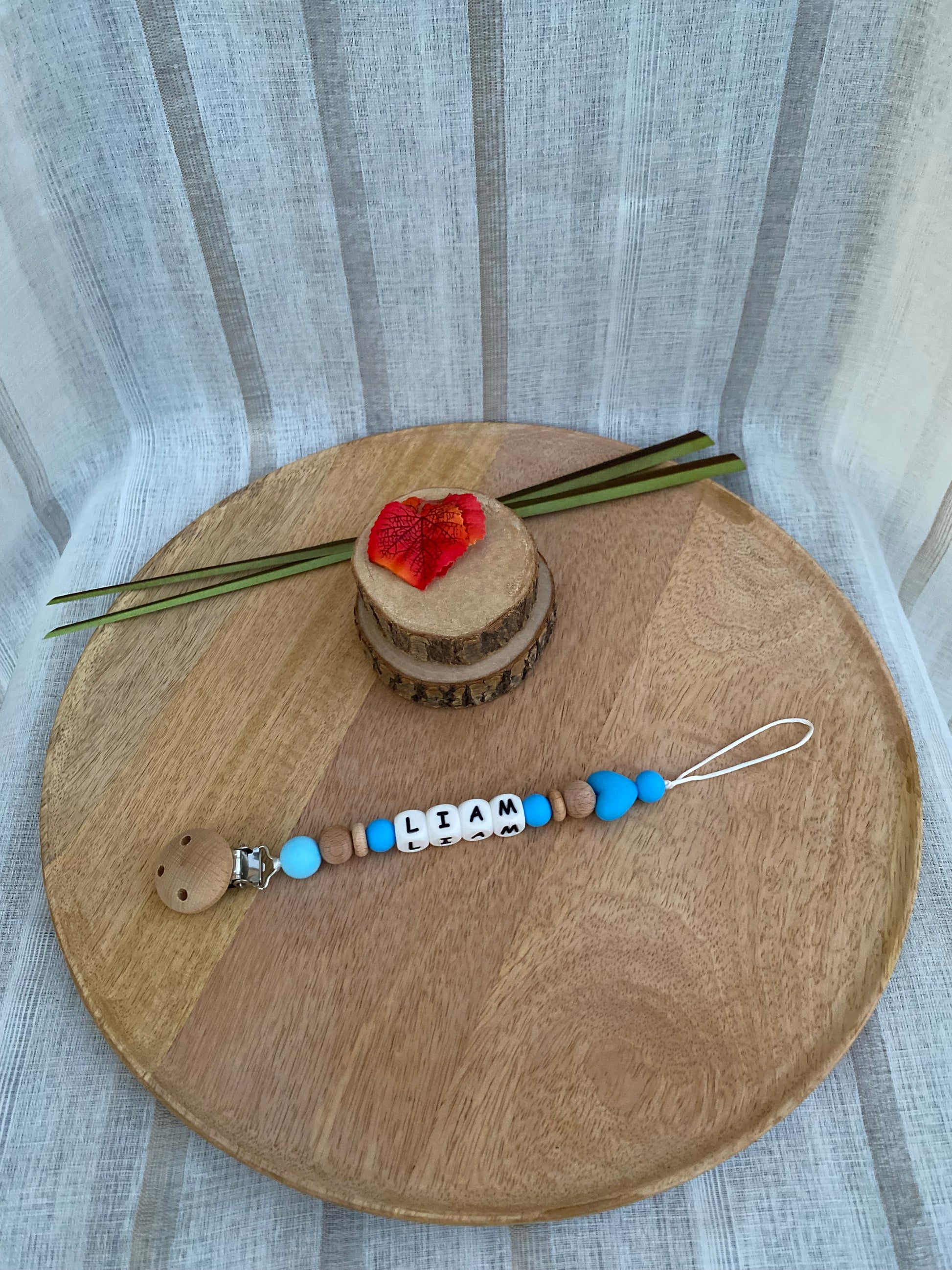 Attache-sucette personnalisable : clip simple, lettre silicone, mélange de perles et lentilles en silicone et bois.