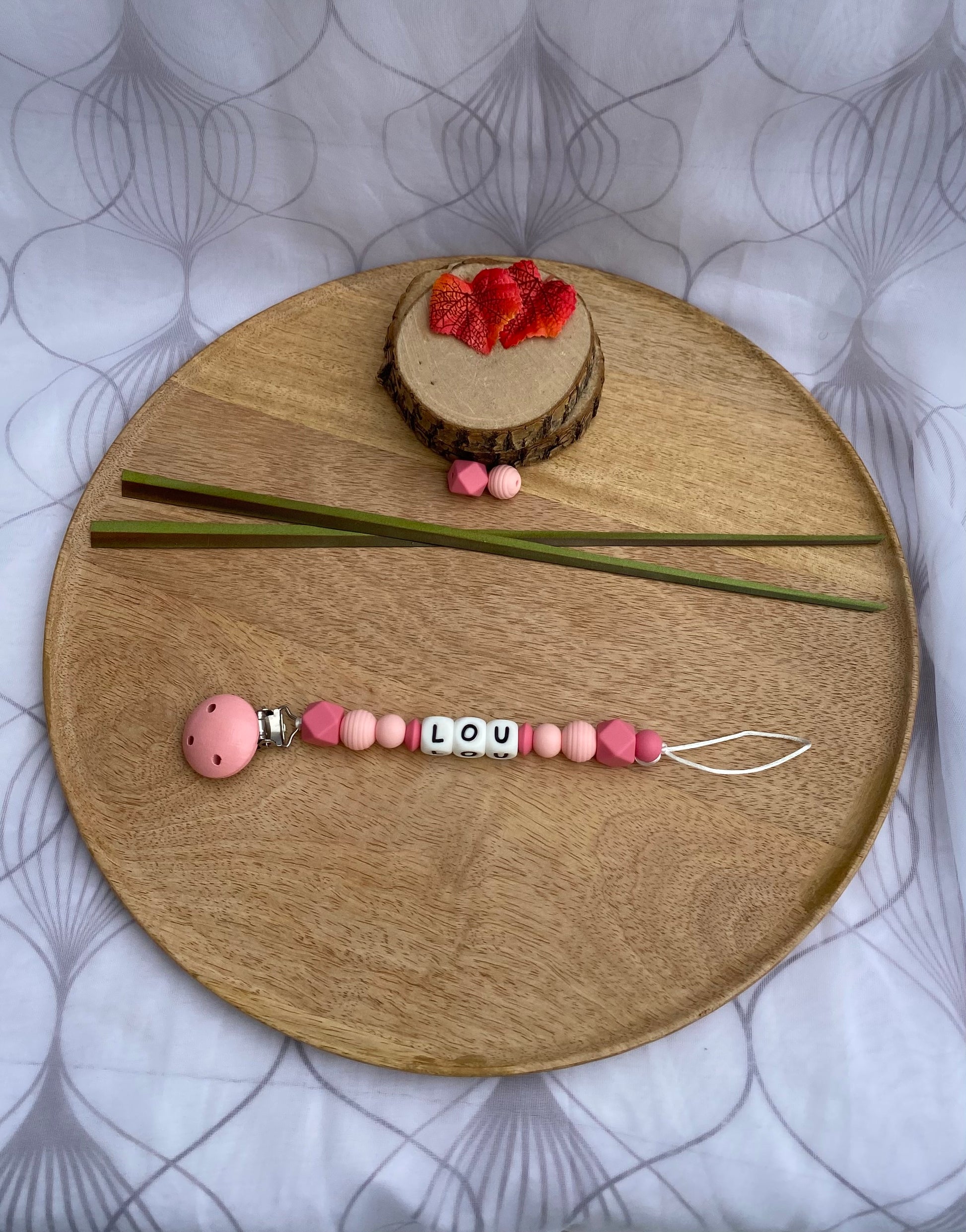 Attache-sucette personnalisable : clip Simple, lettres en silicone et mélange de perles en silicone.