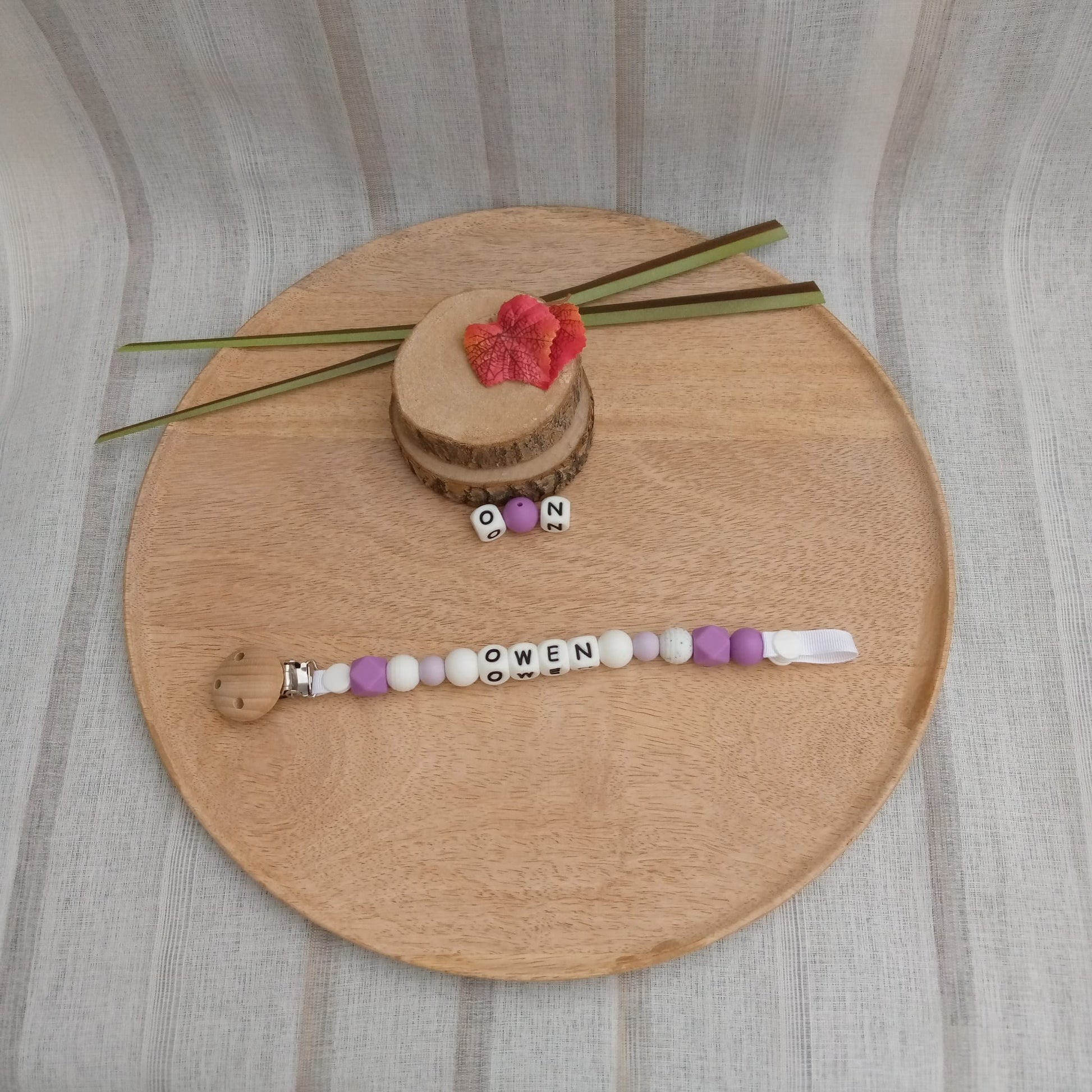 Attache-sucette personnalisable : clip simple, lettres en silicone et mélange de perles en silicone.