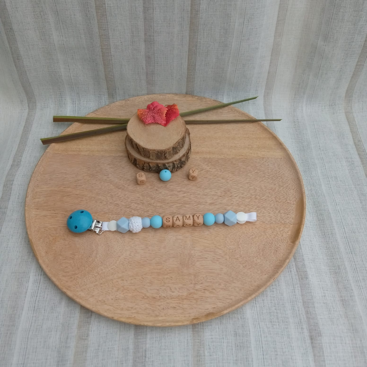Attache-sucette personnalisable : clip simple, lettres en bois, mélange de perles en silicone.