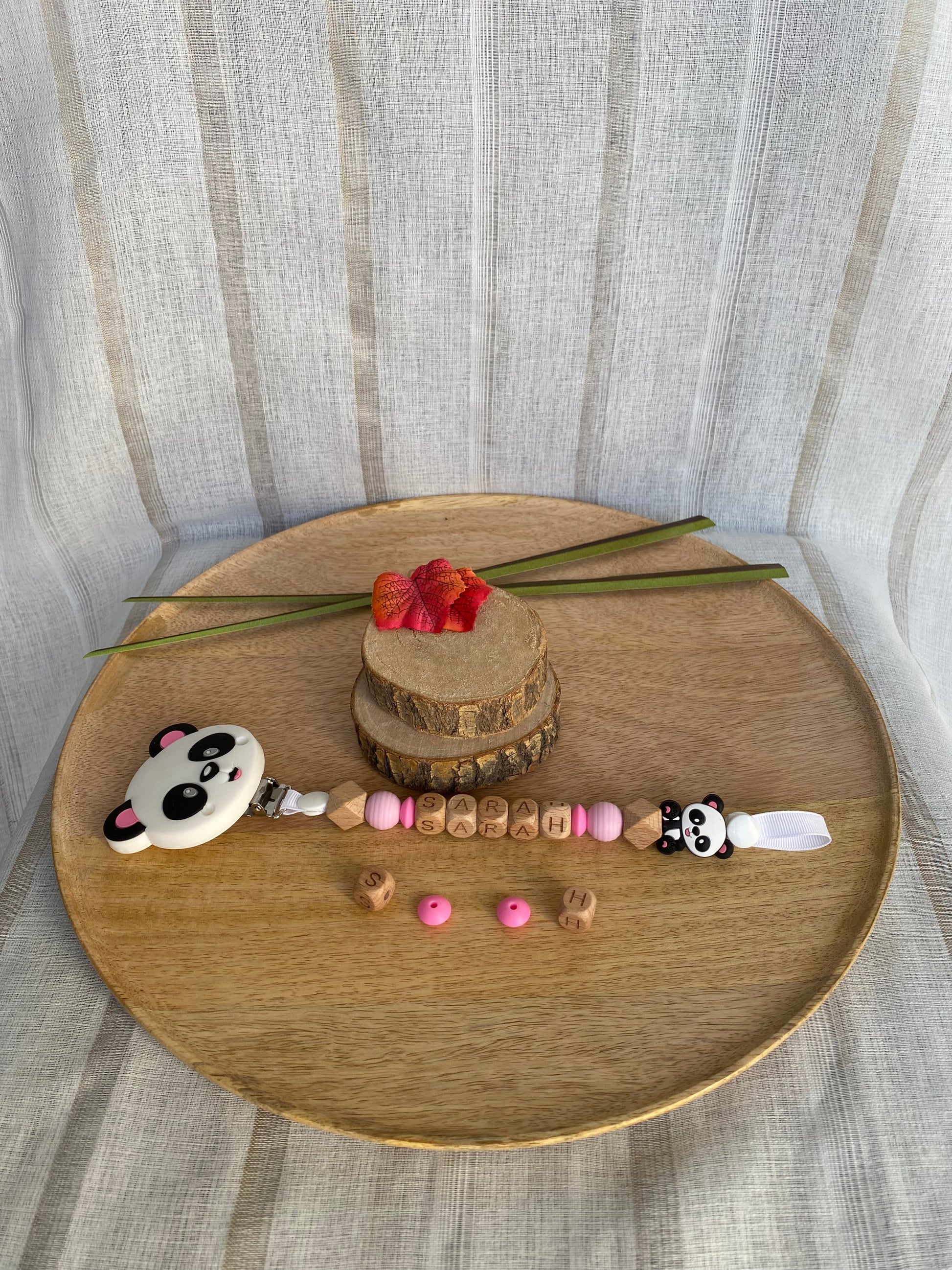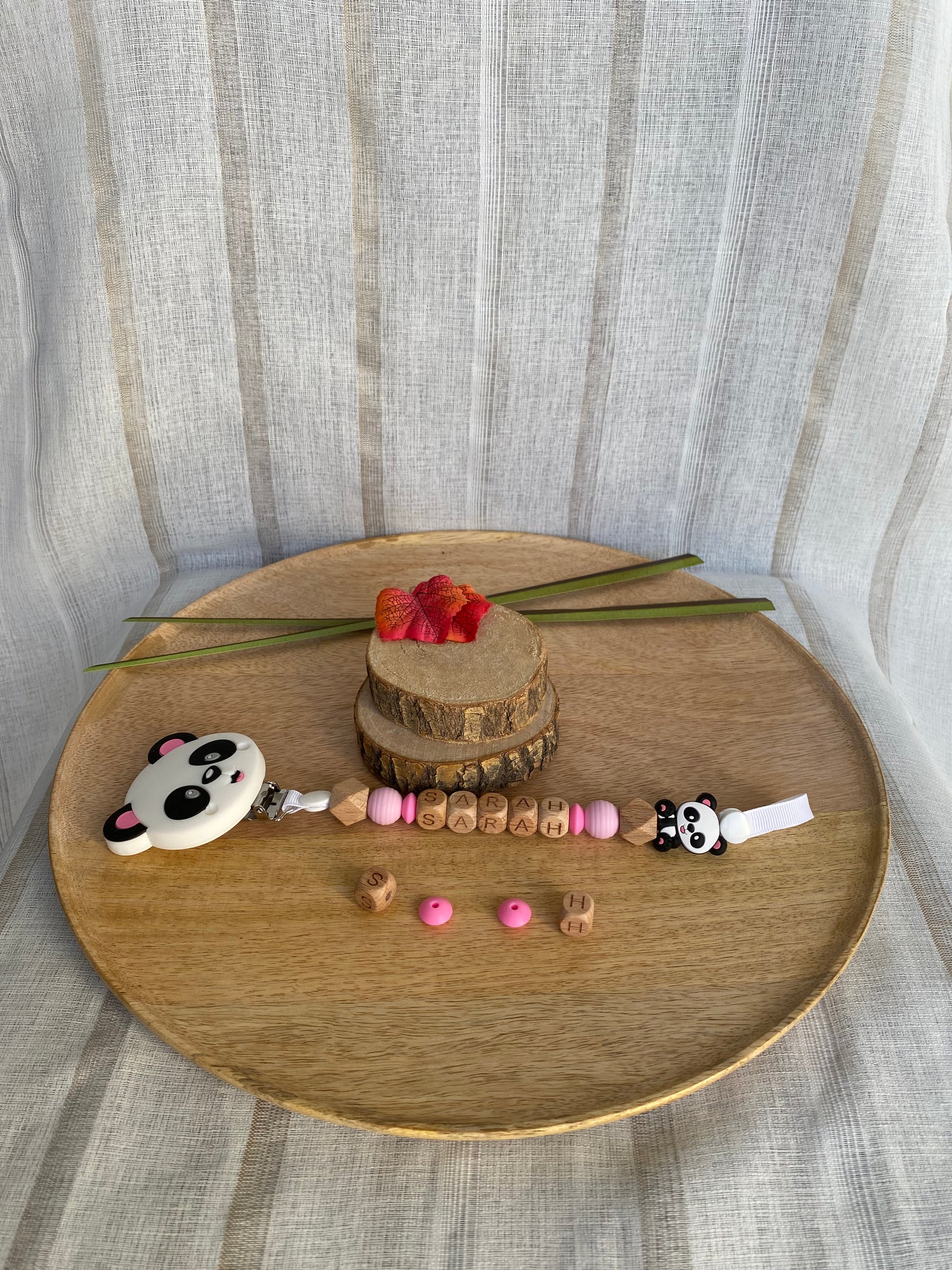 Attache-sucette personnalisable : clip fantaisie, lettres en bois, mélange de perles en bois et silicone.