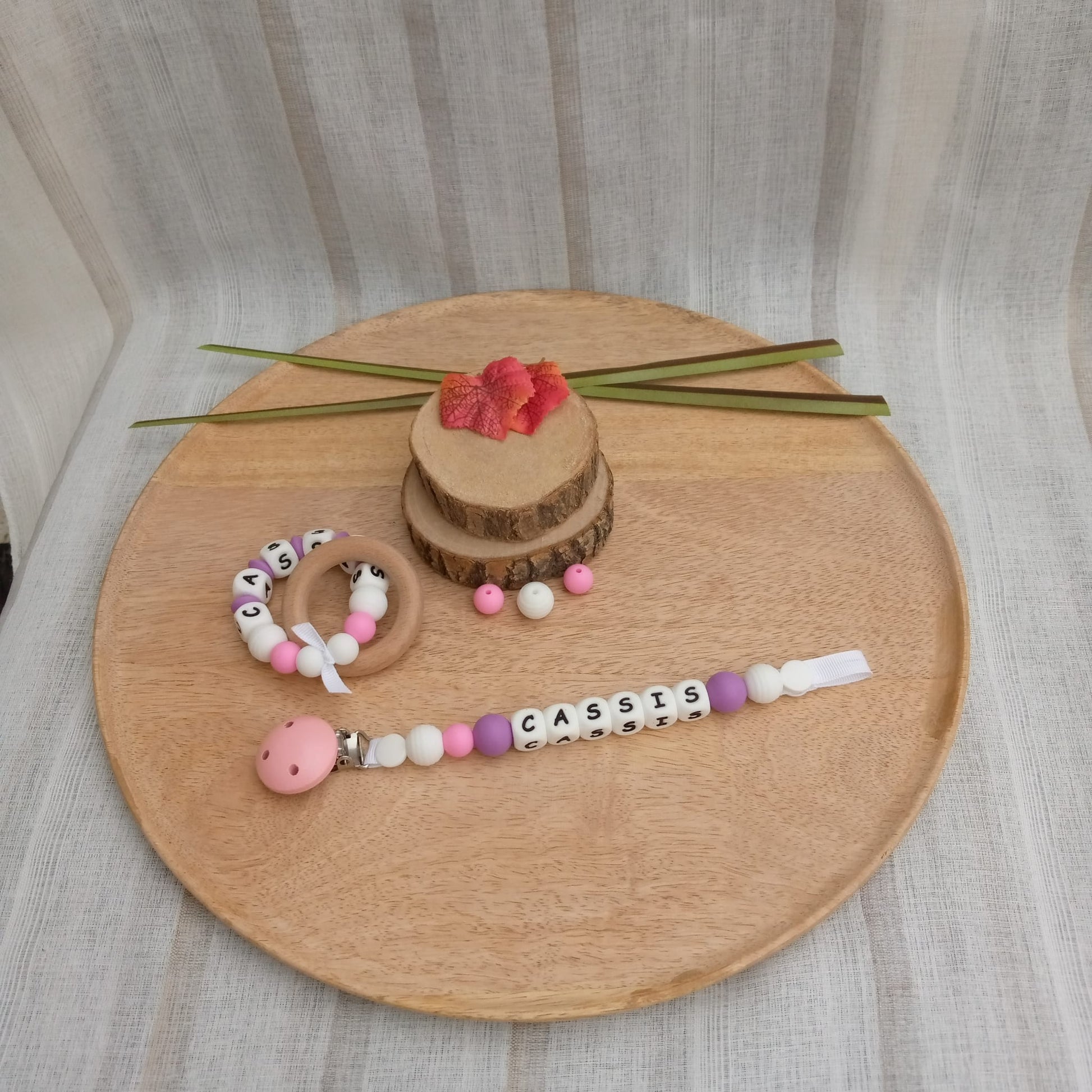 L'attache-sucette personnalisable : clip simple, lettres en silicone, mélange de perles en silicone.