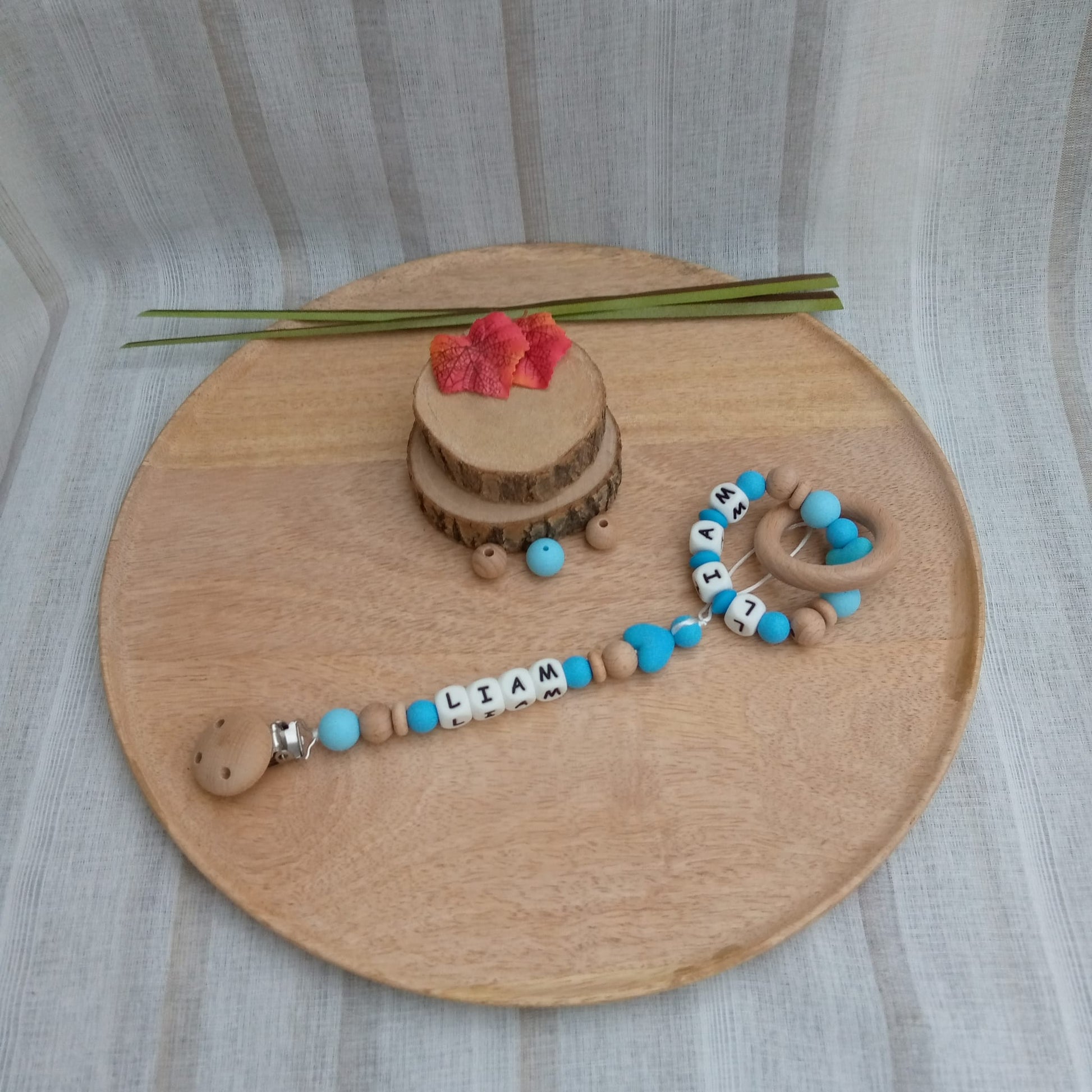 L'attache-sucette personnalisable : clip simple, lettres en silicone, mélange de perles en silicone et en bois.