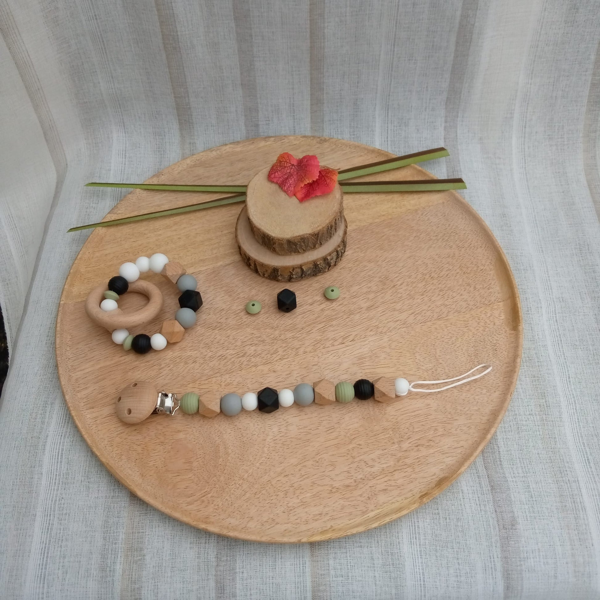 L'attache-sucette personnalisable : clip simple, mélange de perles en silicone et en bois.
