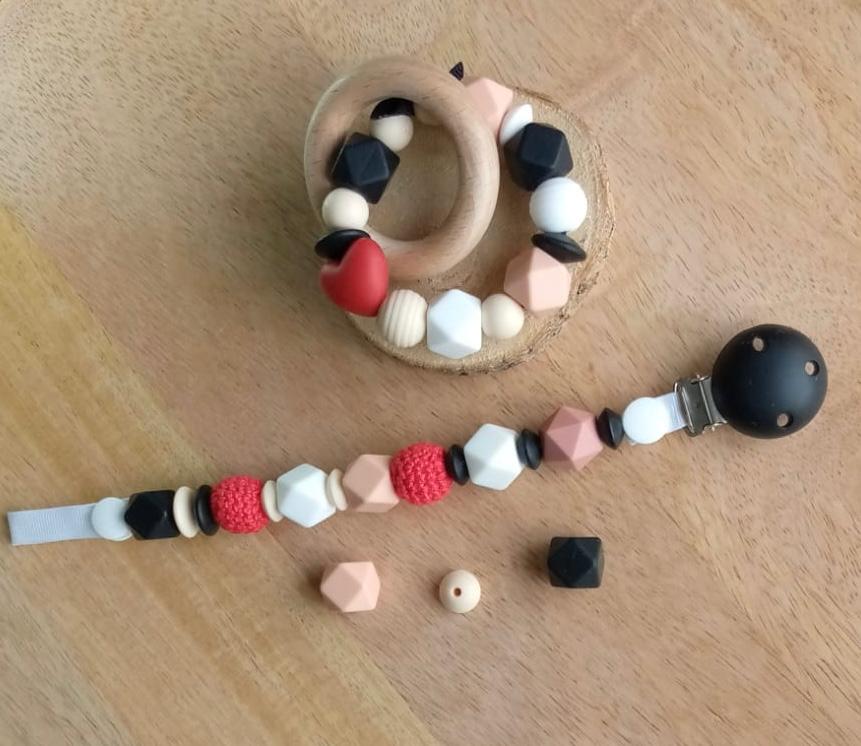 L'attache-sucette personnalisable : clip simple, mélange de perles en silicone et en crochet.