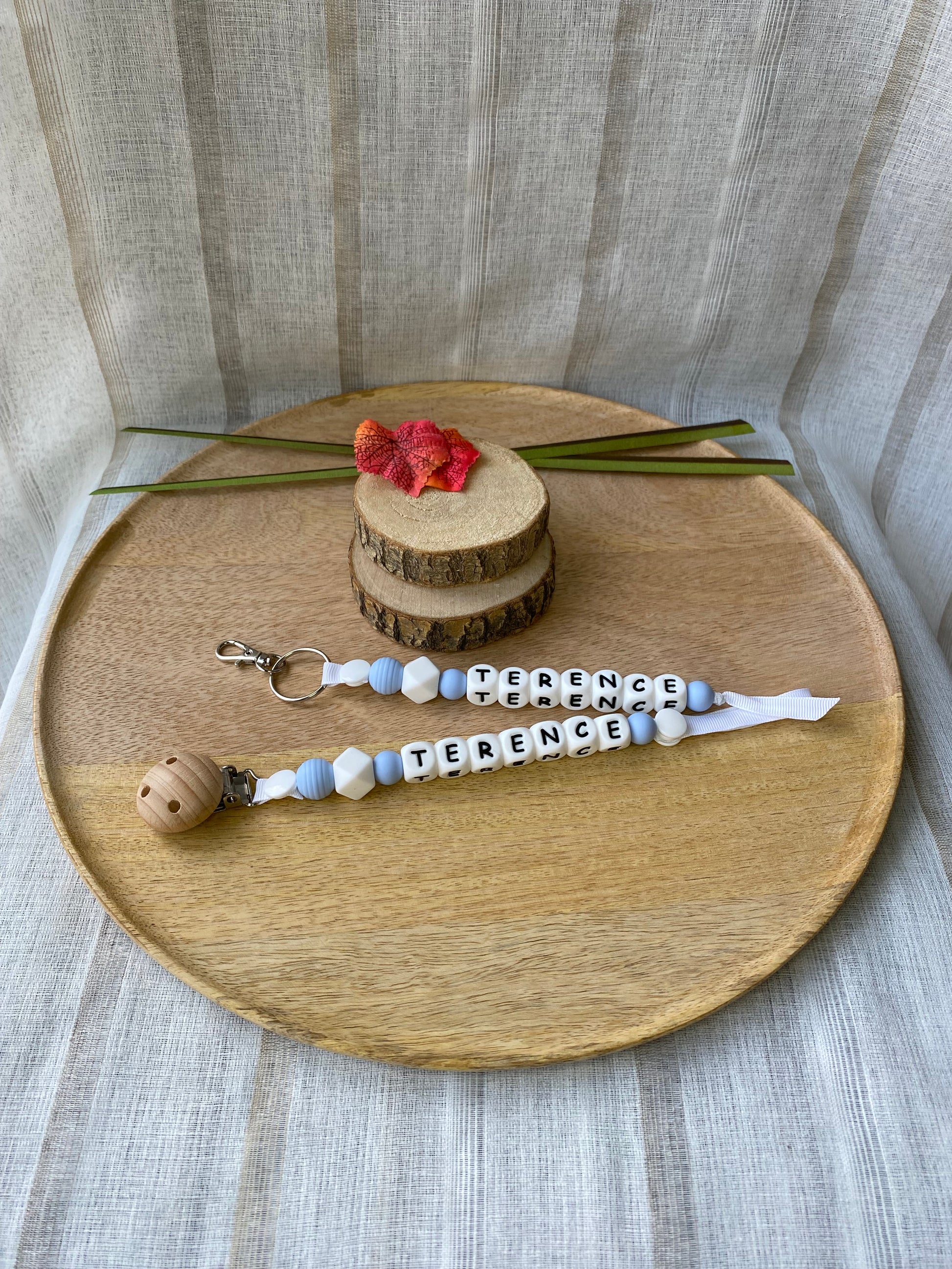 Coffret duo composé d'une attache-sucette et d'un porte clé.