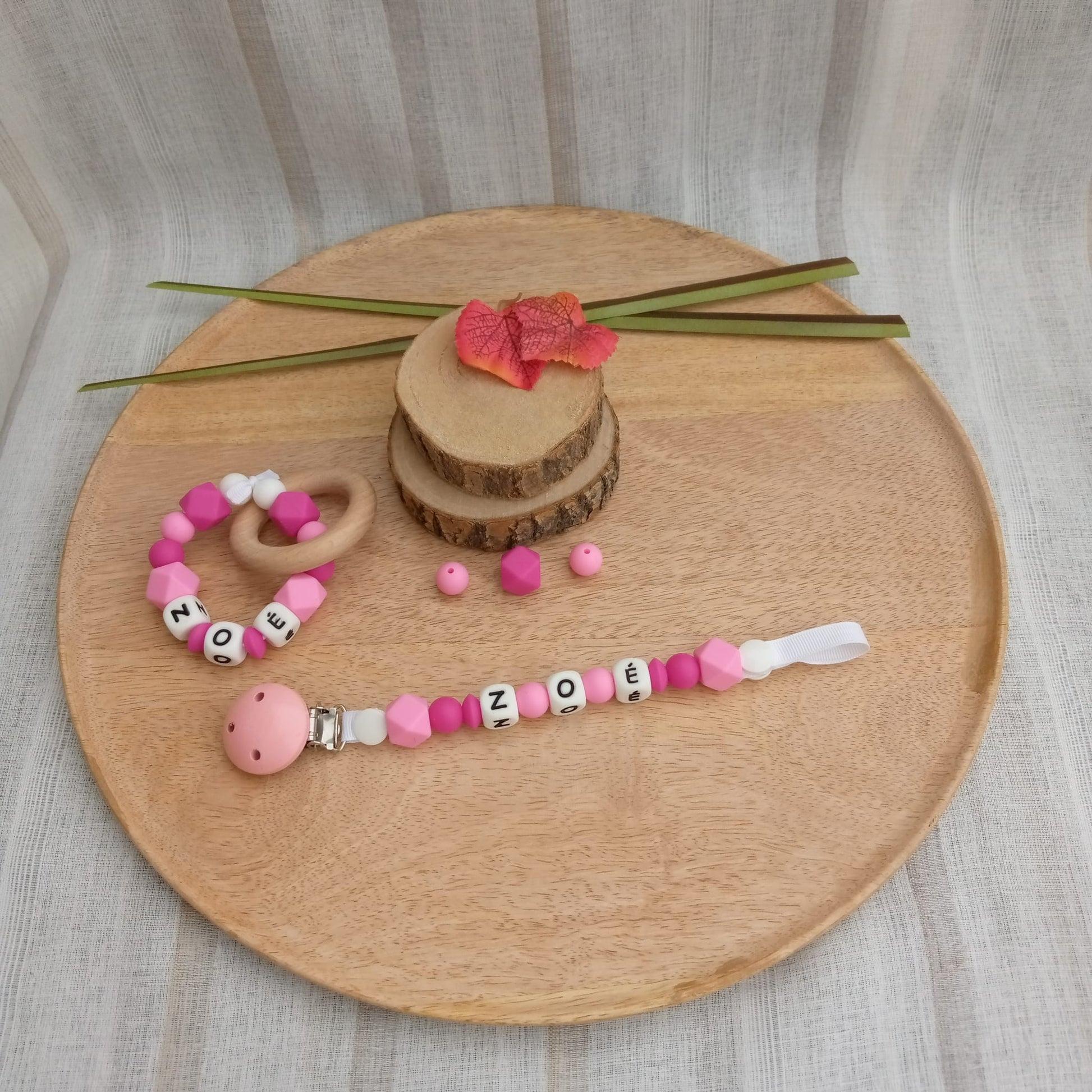 L'attache-sucette personnalisable : clip simple, lettres en silicone, mélange de perles et lentilles en silicone.