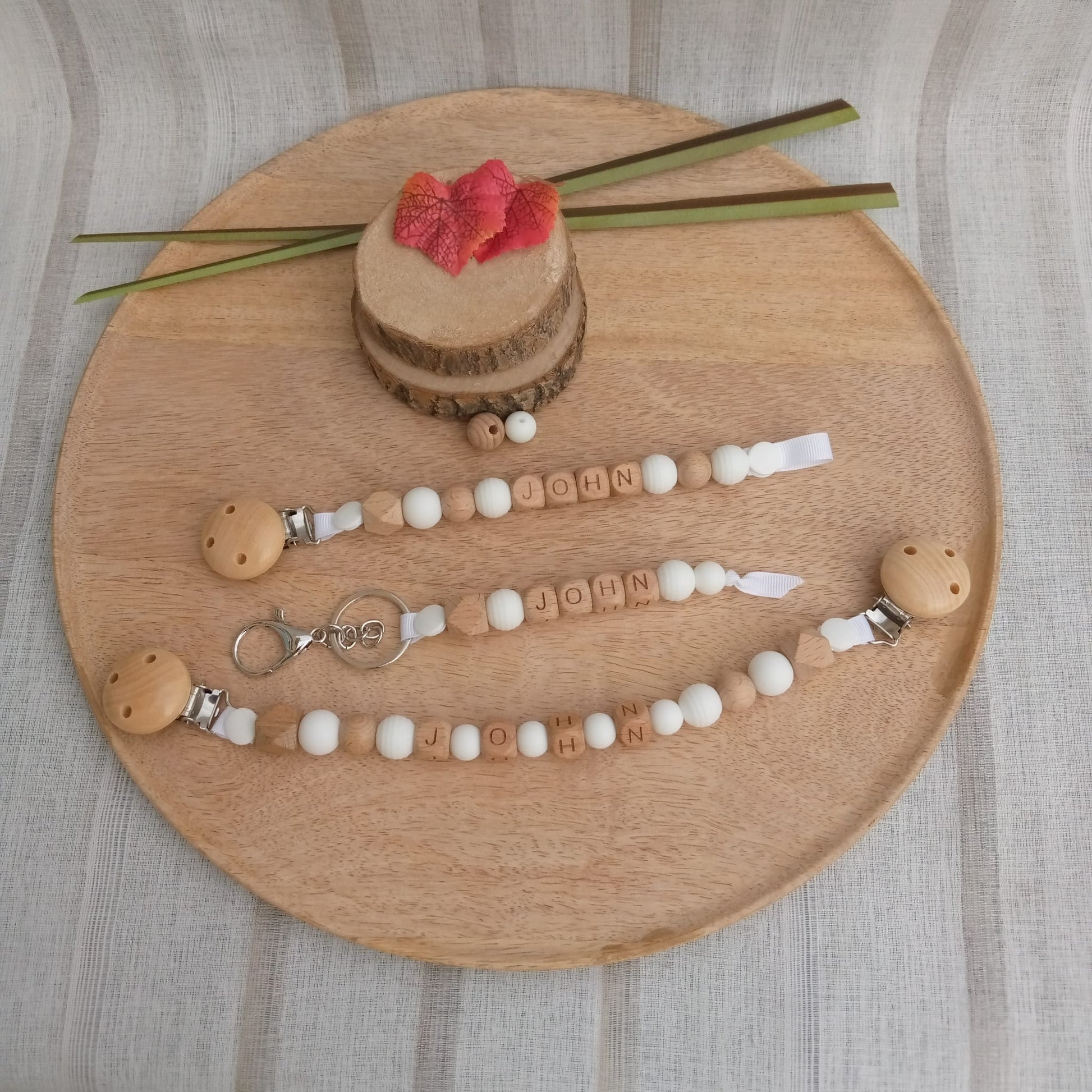 Coffret trio composé d'une attache-sucette, d'un attache doudou et d'un porte-clé.