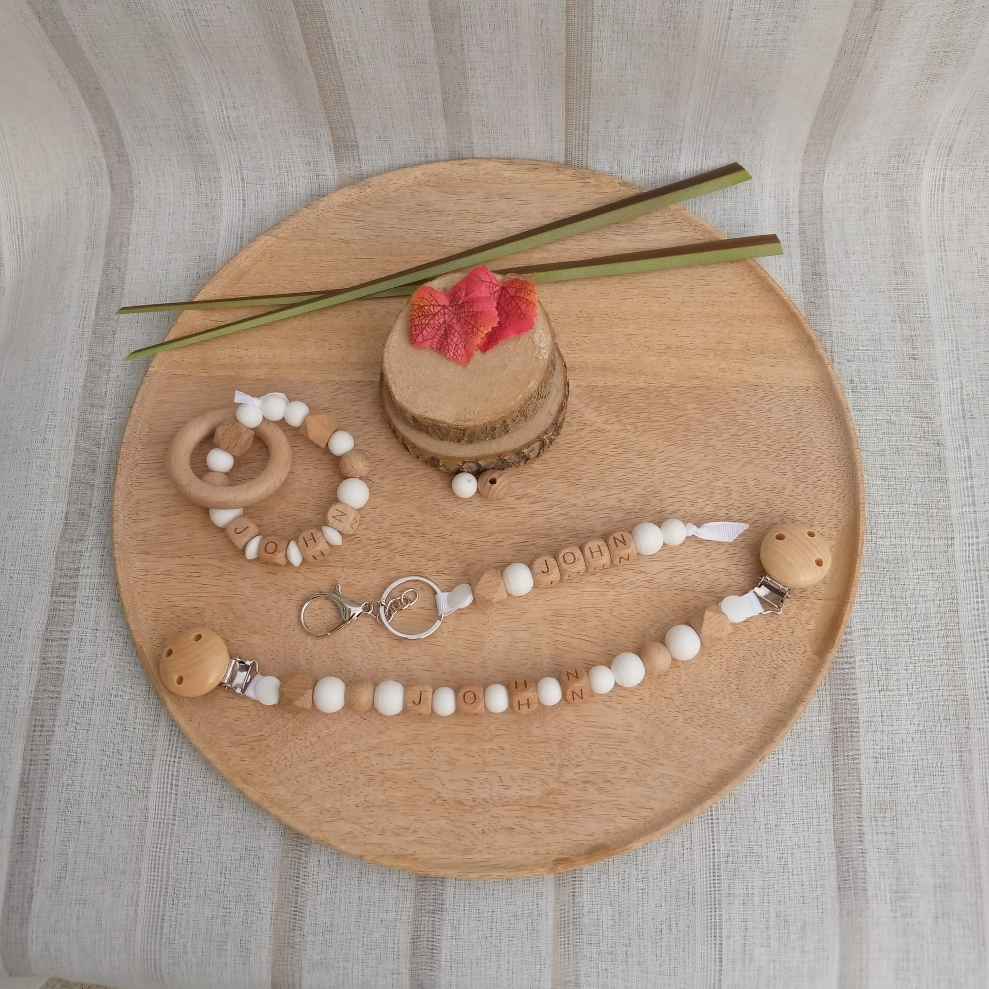 Coffret trio composé d'un anneau de dentition , d'un attache doudou et d'un porte-clé.