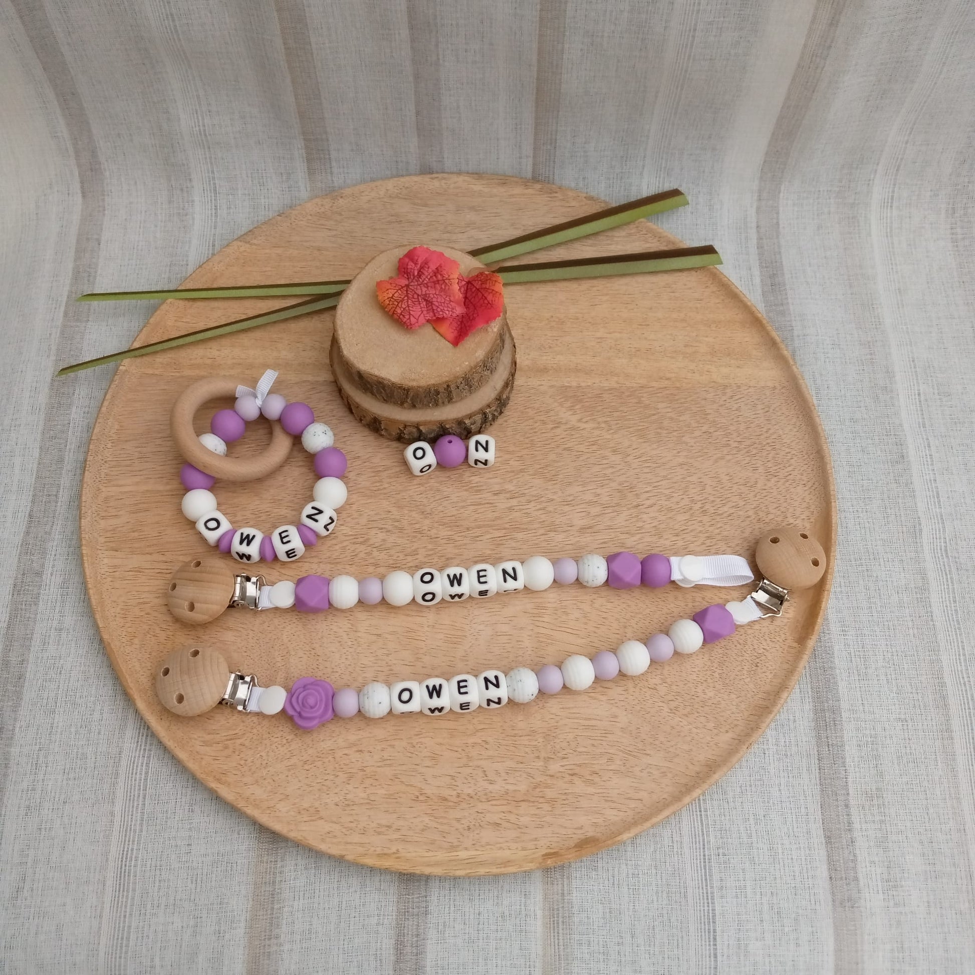 Coffret trio composé d'une attache-sucette, d'un attache doudou Fantaisie et d'un anneau de dentition.